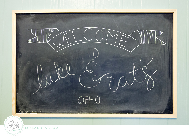 What better place to start than a tour of our office! We redid our office this year a little bit. We have had the same desks for about a year, but we repainted the walls from a dark navy blue to a light minty green that matches our branding more. We feel so happy any time we step into our office now! The wall color we chose is Benjamin Moore Palladian Blue.We used to have our walls filled with canvases, but when we repainted we wanted something a little different. Luke's always wanted a chalkboard, so he got one that he can write on. It usually says the name of whoever we're having come to our house that day, not "Luke and Cat's Office" as below. Luke just wrote that before he took the picture. Sometimes it just says Wilma and Hudson, of course. One day I walked in and it said "NOT Welcome Zombies" but we might have just spent the past 2 days watching Season 1 and Season 2 of The Walking Dead. And if you aren't watching that you should. :)
