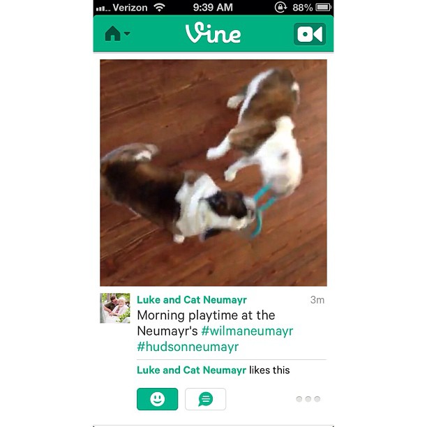 So we're on Vine! If you want to be on Vine, it connects through Twitter. Since we have a shared Twitter account (@lukeandcat) our Vine is also shared. So far, all we really have is either food or videos of Wilma and Hudson. If you want to find us on Vine, you have to search by name - so to find us, you would type in 'Luke and Cat Neumayr.'