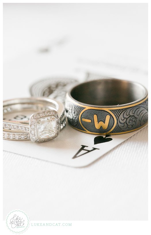 This particular wedding band was customized with the brand of the groom's cattle ranch and some custom scrolling to look like tooled leather. The ring was made custom from Reads Jewelers in Fort Worth, Texas.