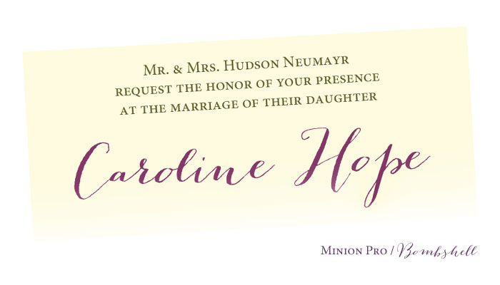 This combo of Minion and Bombshell would be great on an invitation. Minion is a classic serif font that I especially love if styled in small caps. Bombshell is one of my favorite fonts ever because it looks hand-drawn.