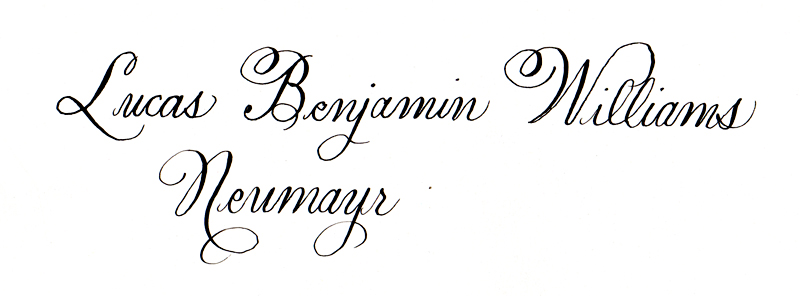 When we found our wedding invitation calligrapher, Jennifer Taylor, we were SO happy! We went to her house, looked over all of her jaw-dropping samples and in the end she created a style that was completely custom to us and matched our invitations to a tee! When we went to pick up our invitations I even asked Jennifer if she could write my name in calligraphy. She did and did it with ease. The only thing is that she wrote my name as Lucas Benjamin Williams! Williams was Cat's maiden name, so we got a good laugh out of that :)After going through the process of selecting our wedding invitations calligraphy, we started to follow other calligraphers and I may have tried to do a little of it myself too. If anyone knows of a calligraphy school, let me know. I have read books, but I think that one-on-one instruction would be best! I have broken too many nibs and turned my fingers black too many times!