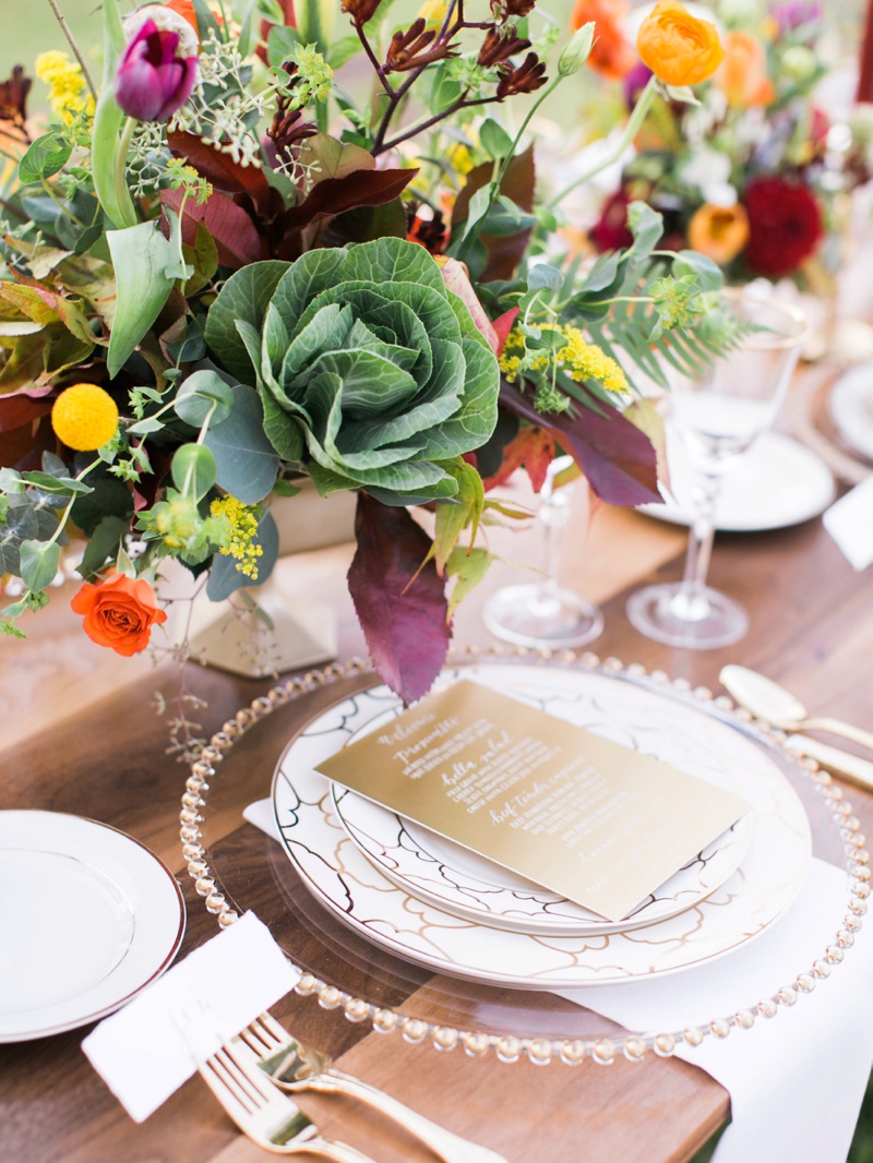 The warm tones of autumn served as the anchors for the table design, which included deep walnut farmhouse tables, flowing textured florals, and accents of copper, brass, and gold throughout the dinnerware. A table highlight was the copper menus, etched with calligraphy descriptions of the four courses. Sophisticated yet adventurous farm to table food was served as our guests toasted their futures and prepared for 3 days of learning and community.