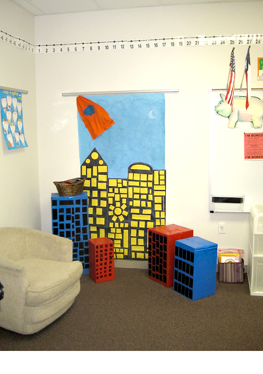 Maybe it was because I had to walk uphill to school, both ways. Or maybe it was because my teachers thumped our hands with rulers if we misbehaved. Or maybe it was that I didn't pay much attention and was more concerned with drawing dragons or making folder forts, but I do not remember any of my teachers going all out like this for their classroom!The theme of Katie's classroom in Hollis' Heros (yay, for the new last name Katie!) so everywhere you look there is some superhero element!