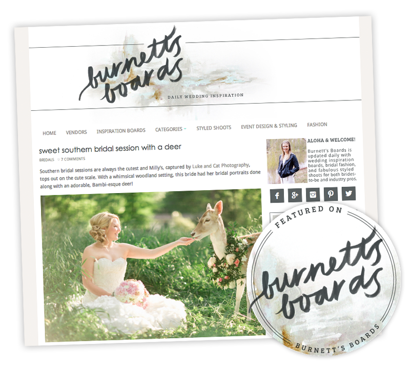 We're so excited to see Milly's bridal session at the deer farm featured today on the national wedding inspiration blog, Burnett's Boards. I'm a huge fan of this blog - I love their branding, and I love following Sara's boards on Pinterest. She has exquisite taste, so I was tickled pink when she wanted to feature Milly's bridal shoot!